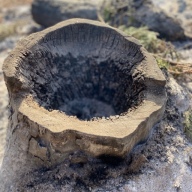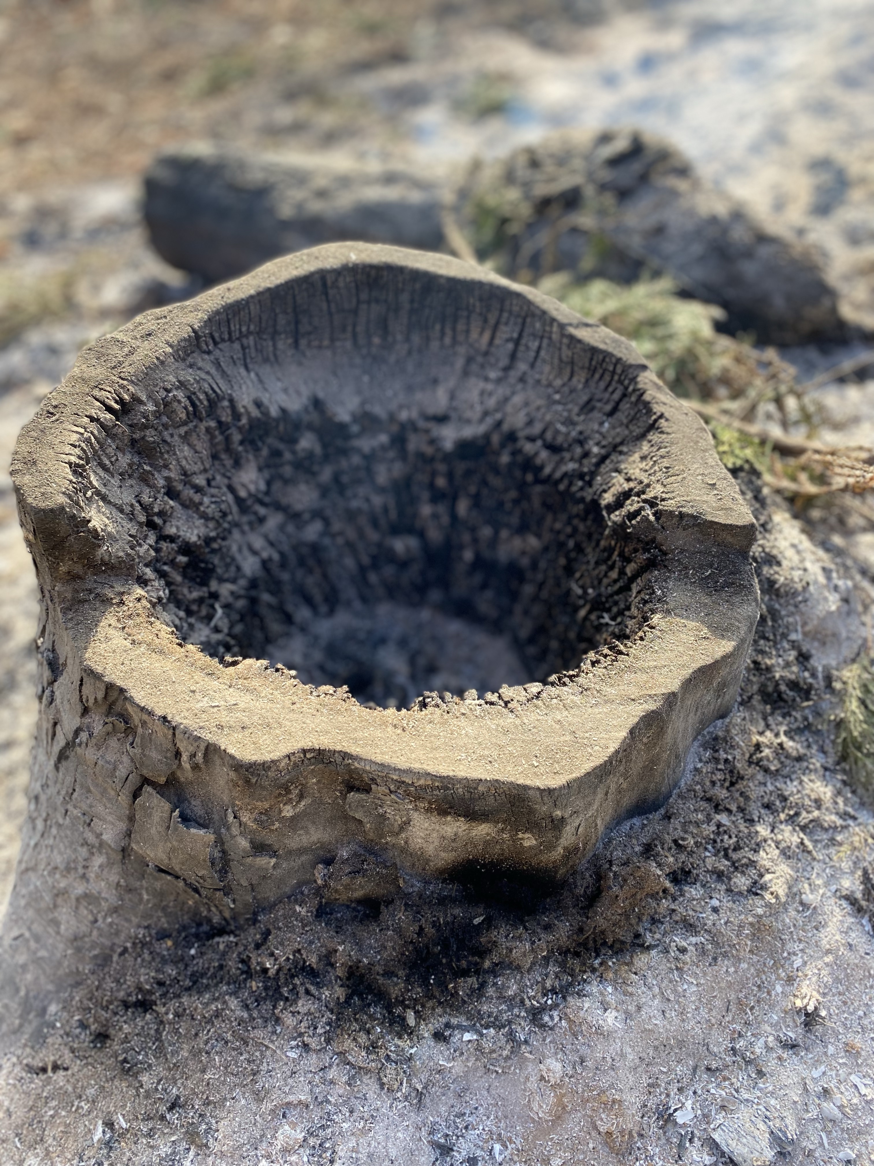 切り株が焚き火の後、阿蘇の外輪山の様に見えた。木の外側は水を吸い上げる。中心部は植物遺体。水が無い場所が早く燃える。